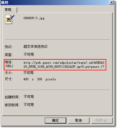 右鍵點(diǎn)擊廣告頁(yè)面,然后選擇“屬性”項(xiàng),在彈出的“屬性”窗口里,把“地址(URL)”里的字符串拷貝出來(lái),然后找出里面包含的域名。請(qǐng)看下圖: