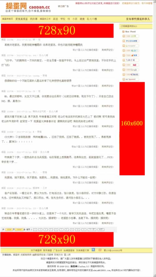 操蛋網的首頁,一共放了3個廣告,在文章列表的頭部和尾部都放置了一個728x90的大橫幅廣告,側欄則放置了一個160x600的摩天大樓廣告。網頁內容簡陋,看起里比較眼花繚亂。