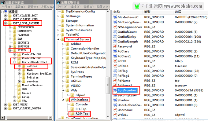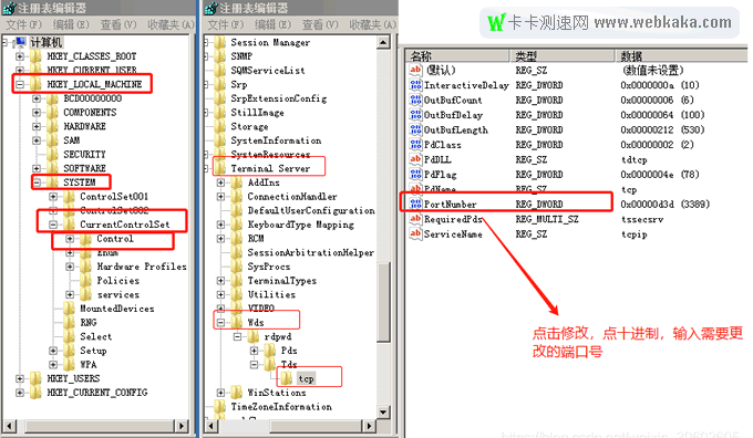 1)、HKEY_LOCAL_MACHINE\SYSTEM\CurrentControlSet\Control\Terminal Server\Wds\rdpwd\Tds\tcp,修改PortNumber值。