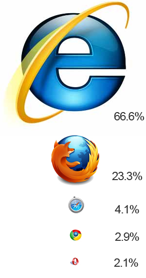 據國外媒體報道,美國互聯網調研公司Net Applications周二發布的統計數據顯示,今年8月份IE瀏覽器的市場份額為66.6%,比上月下滑了1.1個百分點,創出自2008年以來的單月最大跌幅。