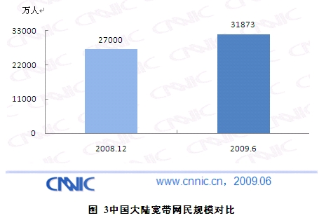 中國寬帶網民規模繼續擴大,截止2009年6月,已有3.2億網民使用了寬帶訪問互聯網,占比高達94.3%,較2008年底上升了3.7個百分點。