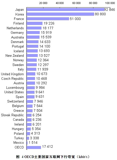 根據OECD的統計,2007年10月,OECD主要國家的平均網絡下行速率已經達到17.4兆,作為寬帶最發達的日本,下行速率甚至已經超過90兆,而中國以ADSL為主的網絡接入,大多數下行速率都不超過4兆。同時,因為是共享帶寬,在高峰時段,速率會更低。