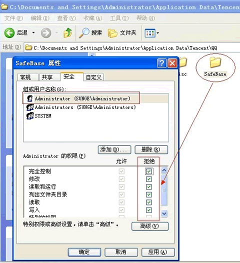 xp系統,在C:\Documents and Settings\用戶名\Application Data\Tencent\QQ下,把SafeBase這個文件夾的權限設置為完全拒絕。