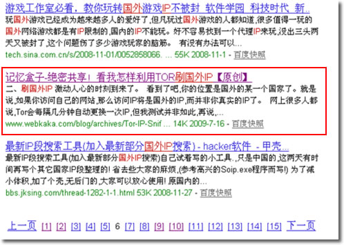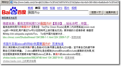 我在搜索輸入框里輸入“刷國外IP”,我看到排在第一位是chinaz的頁面: