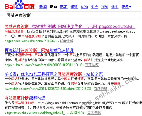 你知道嗎?webkaka去年年底新增的“網站速度診斷”欄目,就是采用二級域名這個SEO技巧的。不用http://www.cuckooft.com/pagespeed/而是使用http://pagespeed.webkaka.com。該欄目上線3個月后,在百度搜索“網站速度診斷”,排在第一位的已經是它了。