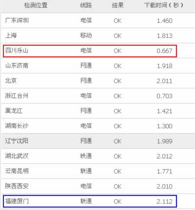 從網站全國各地打開速度的測試結果來看,全國平均速度為2.571秒,最慢的是黑龍江網通,需要5.072秒,最快的是四川樂山電信,需要0.892秒。而從線路分析結果來看,電信平均速度為1.412秒,網通(聯通)平均速度為3.533秒,電信打開的速度明顯快于網通打開的速度。