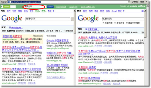 測試方法很簡單,在頂部的輸入框里輸入要搜索的關鍵詞,然后點擊“Search”按鈕,搜索結果就會立即顯示在下面兩個框架里,左邊是Google,右邊是Caffeine。