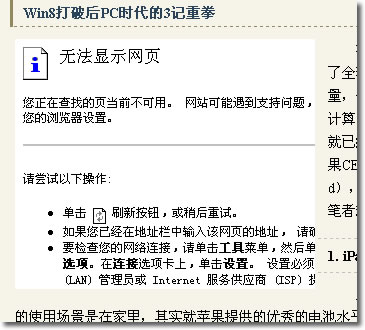 為了證實我的猜想沒有錯,我打開其他站長的博客,果然,adSense廣告不能顯示了,出現“無法顯示網頁”的報錯頁面。