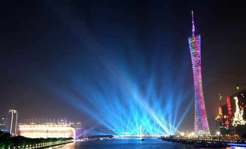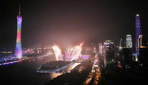 相對于煙花四起的開幕式會場來說,珠江左側的廣州塔,更為絢麗矚目,廣州塔高度達600米,為世界第一高電視塔;而珠江右側的“西塔”,則是廣州第一高樓——432米。“兩塔”高高聳立,金碧輝煌,相映成趣。