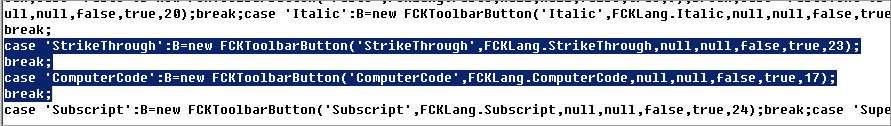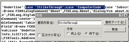 我修改的方法是完全仿照編輯器上另一按鈕刪除線(StrikeThrough)的標簽,在 fckeditorcode_ie.js 里查找 StrikeThrough ,然后添加與之語法一樣的 ComputerCode 。一共有三個位置。