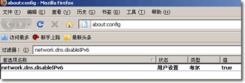 3、雙擊首選項(xiàng)名稱里的network.dns.disableIPv6,看到值變?yōu)?strong>true。
