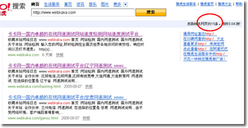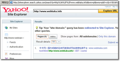 4、在Search框輸入你要管理的網址,例如:site:www.webkaka.info,注意:前面加上“site:”,點擊“Web Search”按鈕,出現如下界面所示,