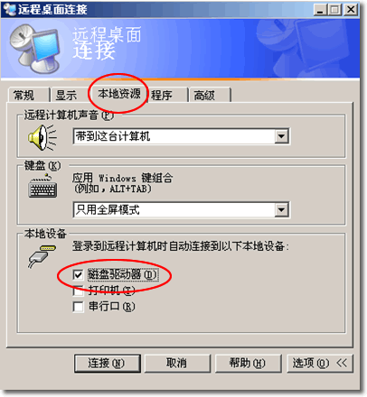 如下圖,我們?cè)谶B接遠(yuǎn)程的時(shí)候,把“磁盤驅(qū)動(dòng)器”選上: