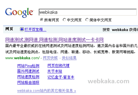 并不一定在搜索“webkaka”的時候才出現這些網站鏈接,在搜索“卡卡測網速”、“卡卡網速測試”、“卡卡網站測速”的時候也會出現這些網站鏈接,不過在搜索“卡卡網站測速”的時候,出現的網站鏈接只是一排過的效果,沒有上圖那么多,可能是這個關鍵詞還沒有達到一定的流量吧。