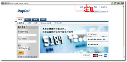 1、登陸Paypal官方網站:http://www.paypal.com, 然后點擊右上方的“注冊”。