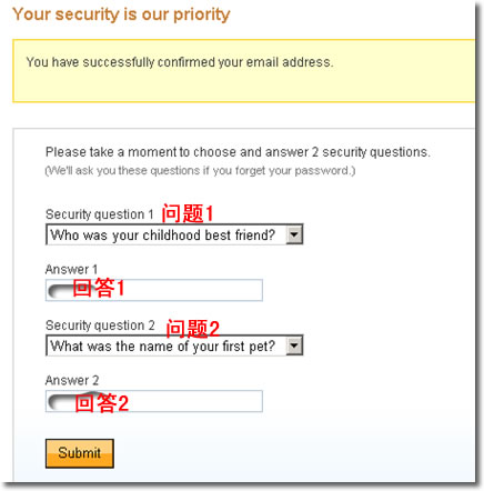 7、激活時要求填寫忘記密碼時用到的安全提示問題: