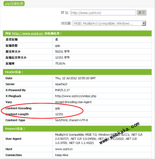 這里將要研究的對象是園子的博客http://www.yzznl.cn/,該博客已經(jīng)采用了GZip壓縮技術(shù)。你可以通過這里進行GZip壓縮檢測。