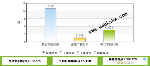 從上圖可以看到,網(wǎng)頁大小是50275字節(jié),沒有經(jīng)過Gzip壓縮,平均打開時間是5.128秒,而滿意度得分僅得59分(什么是滿意度得分?)。