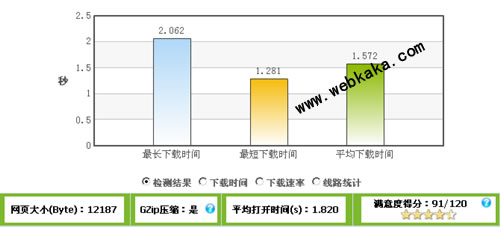 選擇的測試工具是webkaka網(wǎng)站測速工具,webkaka的老用戶請注意了,webkaka網(wǎng)站測速已經(jīng)新增了網(wǎng)站是否啟用GZip壓縮的判斷。可以使用Gzip壓縮打開網(wǎng)頁和不使用Gzip壓縮打開網(wǎng)頁兩種方式進行測試網(wǎng)頁打開速度。