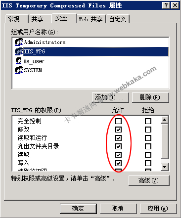 通過測試,GZip臨時目錄需要添加如下權限即可:IIS_WPG用戶組、IIS用戶。同時需要賦予它們的讀寫權限。設置如下圖所示: