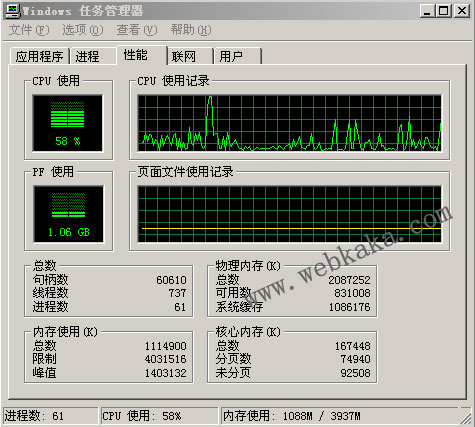 asp執(zhí)行程序時cpu峰值升到58%,使用內存顯示是1.06GB。