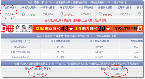 以上數據很明顯的說明了alexa統計確實有問題,云南大學真夠冤的,日均IP縮水了將近2/3,而日均PV更是只有實際的1/10!