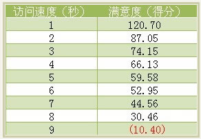 這里將2秒作為網站打開速度的滿分時間,訪問速度得分滿分一百分,最高不超過120分,最低無下限。實際上,用戶對網站打開速度的滿意度與時間應該是非線性函數。如果網站2-4秒內打開,用戶對速度會比較滿意;4-6秒打開時,已經明顯感到緩慢了;如果6-8秒網站還沒打開,用戶的耐心會直線下降。