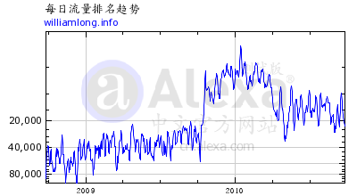 從圖中曲線看到,月光博客alexa排名在2010年1月達到最高峰,進入了5000名內,而現在月光博客的alexa排名一般在1萬-2萬之間,所以,從alexa排名來分析,月光博客的流量峰值應該是在2010年1月份的時候。