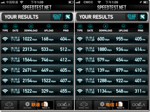 信號質量或者說上網網速是我們測試最為重要的內容。官方的參數,聯通 E5 支持下行最高速率 7.2 Mbps,上行 5.76 Mbps,而電信 E5 支持下行 3.1 Mbps,上行 1.8 Mbps。