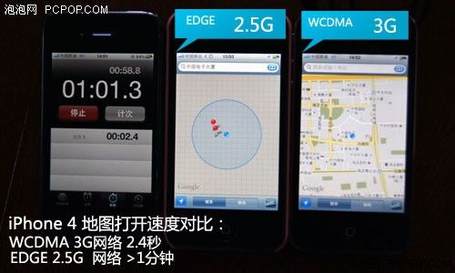 WCDMA網絡的超快速度在本功能上印證明顯,從打開到定位再到地圖顯示僅需2.4秒,而使用EDGE 2.5G網絡的另一臺iPhone 4打開速度平均時間超過了一分鐘。