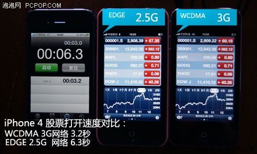 WCDMA網絡下的iPhone 4打開股票程序僅需要3.2秒,而另一款使用2.5G EDGE網絡的手機則需要6.3秒。注意此圖片內兩款手機股票價格,WCDMA版本iPhone顯示的價格要高于EDGE版本,這是由于 WCDMA網絡速度要比EDGE 2.5G速度快很多,對于投資者而言,這一小小的差距相差的價值可謂差之毫厘謬以千里了。