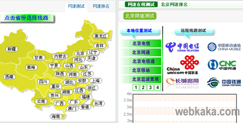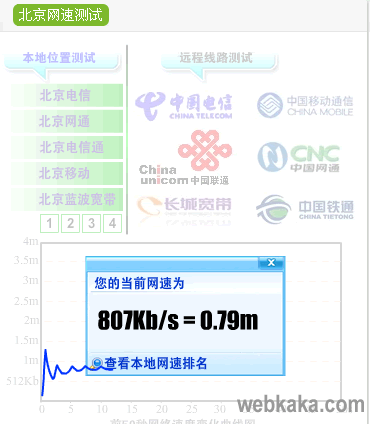 卡卡網速測試平臺是國內權威的測速網站,網站有多種線路可供選擇,用戶根據網絡使用情況選擇測試線路,測試點遍及全國各省、美國、澳大利亞、日本等海外國家,用戶可選擇任意測試點進行測試,網站采用flash實現測速功能,可視化的測試過程,測試結果能準確反映本地網絡速率,無需下載安裝插件或添加額外設備,使用簡單,操作方便。