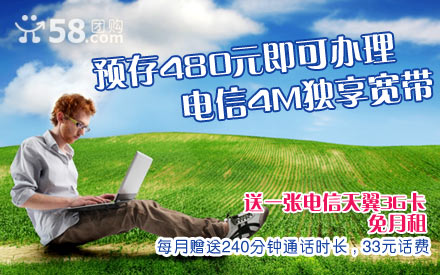 廣州團(tuán)購(gòu):預(yù)存480元即可辦理電信4M獨(dú)享寬帶1308/包年【原價(jià)4580/2年】,預(yù)存480分24個(gè)月返還,送一張3G手機(jī)卡,每月有33元話費(fèi)與240分鐘通話時(shí)長(zhǎng)!