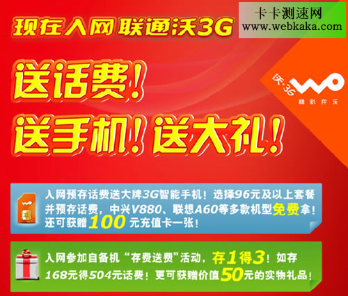 現在辦理聯通沃家庭業務,更有三重優惠任您選擇!如果您想擁有一部3G智能手機,聯通幫您來解決。您只要承諾使用聯通3G號2年,并選擇96元套餐,就可免費獲得價值千元中興V880智能手機一部。您用沃3G,聯通送手機。