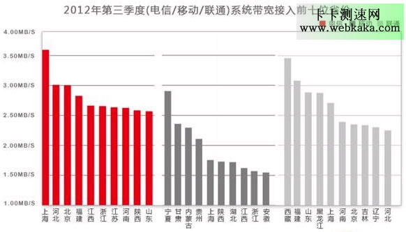 上海是唯一一個網速超過3Mb/s的地方,但前5位的省市全部超過了2.5Mb/s,本次統計網速超過2.5Mb/s的省市共有7個,它們分別是上海、山東、福建、黑龍江、江西、浙江和江蘇。