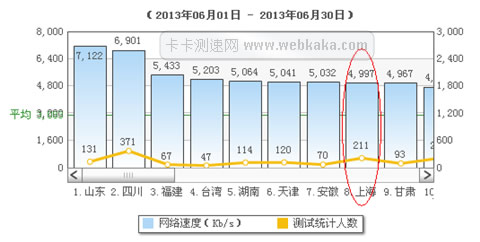 上圖為2013年6月份全國網速排名圖,上海已經跌到了第8名,平均網速僅為4997kb/s,只是排名第一位山東的70%。