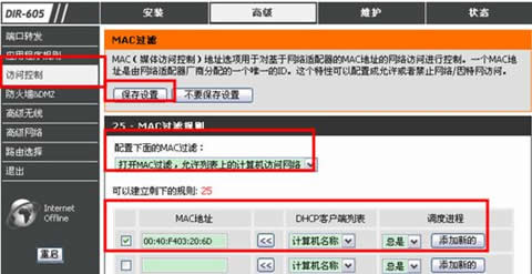 回到路由器配置界面,找到MAC過濾規(guī)則一項,選擇“打開MAC過濾,允許列表上的計算機(jī)訪問網(wǎng)絡(luò)”,將您確定要連接到DIR-605上的各臺PC的MAC地址逐一添加進(jìn)來,一共可以添加25條,最后點(diǎn)擊保存設(shè)置以使其生效。配置完該功能后,沒有出現(xiàn)在MAC過濾規(guī)則中的PC均無法正常連接到DIR-605上。