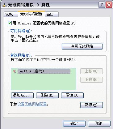 上述內(nèi)容填寫完畢確定后,就可以發(fā)現(xiàn)在無線網(wǎng)絡(luò)連接 屬性------首選網(wǎng)絡(luò) 中看到我們剛才建立的一個可用網(wǎng)絡(luò)testWPA。
