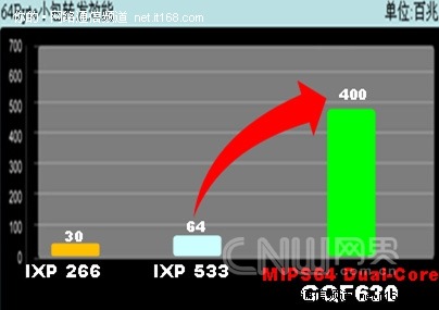 如下圖,俠諾GQF630使用了MIPS鑲入式雙核CPU,雙核效能達到 400Mbps,相對于現有路由器采用的Intel IXP 266處理器的效能提升了13倍多,相對于目前應用非常普遍的主流Intel IXP 533處理器,它的效能也提升了約6倍。