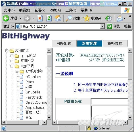 基于專業流控設備的限速,本文中我們以一款測試過的流控設備說明一下實現方法,這款設備位于我們單位局中的硬件防火墻和寬帶用戶管理設備之間,可以針對某一類應用限速,比如我們要對全網中的P2P下載做一個限帶,上/下行不能超過10M,就可以這樣來做。