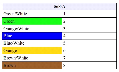 標準568A(金屬線朝正前方時):綠白--1,綠--2,橙白--3,藍--4,藍白--5,橙--6,棕白--7,棕--8