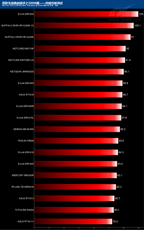 由于測試會有八項數據來體現傳輸的基本性能,分別包括非加密下4項和加密下4項,但是作為橫評來說,一一比較沒有任何意義,因為我們通過加成的方式,把非加密和加密下的成績分別計算出平均值為橫評作為比較,這樣更有意義。(注:由于磊科NW712只有一個百兆LAN口,因此無法測試300M傳輸速度,因此以下成績中不加以體現)