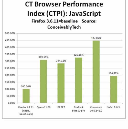 撇開Chrome 10和Safari不說,IE9、Firefox 4、Opera 11在JavaScript性能上并沒有特別顯著地差別,這也反映了一個問題,那就是今后瀏覽器的功能和性能都趨于相近,普通用戶在啟動速度、頁面加載、渲染等方面很難明顯感覺到差異。