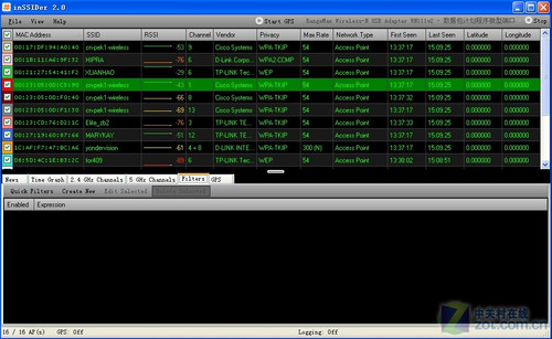 除了常見上述功能,inSSIDer還提供了新聞報道,網絡過濾,GPS等附加功能,感興趣的用戶可以自己嘗試。