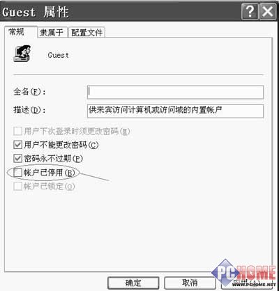 在默認情況下,Win2000和WinXP中的Guest用戶是禁用的。要啟用Guest用戶可以到“控制面板/管理工具/計算機管理/本地用戶和組/用戶”中去掉“賬戶已停用”前面的小勾(圖4)。此用戶最好不要設密碼,并選中“用戶不能更改密碼”和“密碼永不過期”,這樣可以方便用戶訪問并減少出現麻煩的可能性。但前提是必須設置好Guest用戶的權限和所屬組,否則后患無窮。