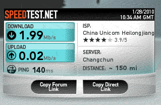 圖2中三個數據一次代表:下載帶寬 1.99Mb/s,上行帶寬 0.02Mb/s,Ping 延時 140ms。帶寬Mb/s換算成KB/s的方法(以下載帶寬1.99Mb/s為例):1.99Mb/s*1024/8 = 254KB/s(以上為本機測試數據,本機所使用的標準帶寬為下行2M,上行128K),可見其數據還是很可靠的。