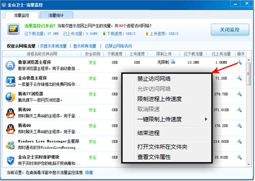 運行金山衛士,執行“系統優化→流量監控”命令,彈出“金山衛士—流量監控”窗口,如圖所示,點擊某個軟件圖標后面的“扳手”按鈕,可以對該軟件進行“禁止訪問網絡”和“限制進程上傳速度”等操作,從而將帶寬節約下來,讓您高速在線觀影。