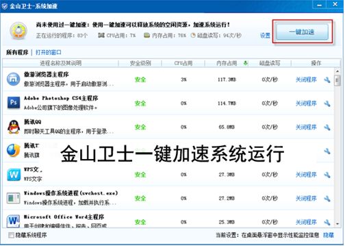 運行金山衛士,執行“系統優化→系統加速”命令,彈出“金山衛士—系統加速”窗口,如圖03所示,在此我們可以手動關閉某個進程來釋放系統資源,也可以點擊右上角處的“一鍵加速”按鈕,讓金山衛士自動為電腦提速。