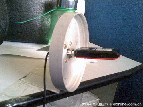 如果說剛才的易拉罐天線近似玩具,而且不美觀,那就請看看接下來這個由網(wǎng)友syll2001制作的3G定向天線吧,這部定向天線是利用鋁合金鍋蓋改裝而成的,關鍵材料是鍋蓋,我們在它的中間位置鉆一個剛好能通過USB延長線接口的孔,在鍋蓋背面用長鏍絲和有機玻璃把USB延長線的接口固定死,不讓它能晃動。