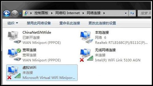 開啟成功,網絡連接中會多出一個網卡為“Microsoft Virtual WiFi Miniport Adapter”的無線。